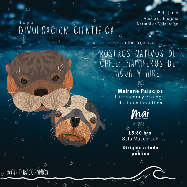 A las 15:30 en la sala Museo-Lab Aprendizaje: Lanzamiento del libro “Rostros de Chile, mamíferos de agua y aire” de Mairene Palacios. Este libro, con 22 ilustraciones a color de fauna nativa y fichas informativas, nos invita a conocer más sobre los mamíferos y la flora de su hábitat. Mairene ofrecerá un taller creativo para todas las edades.