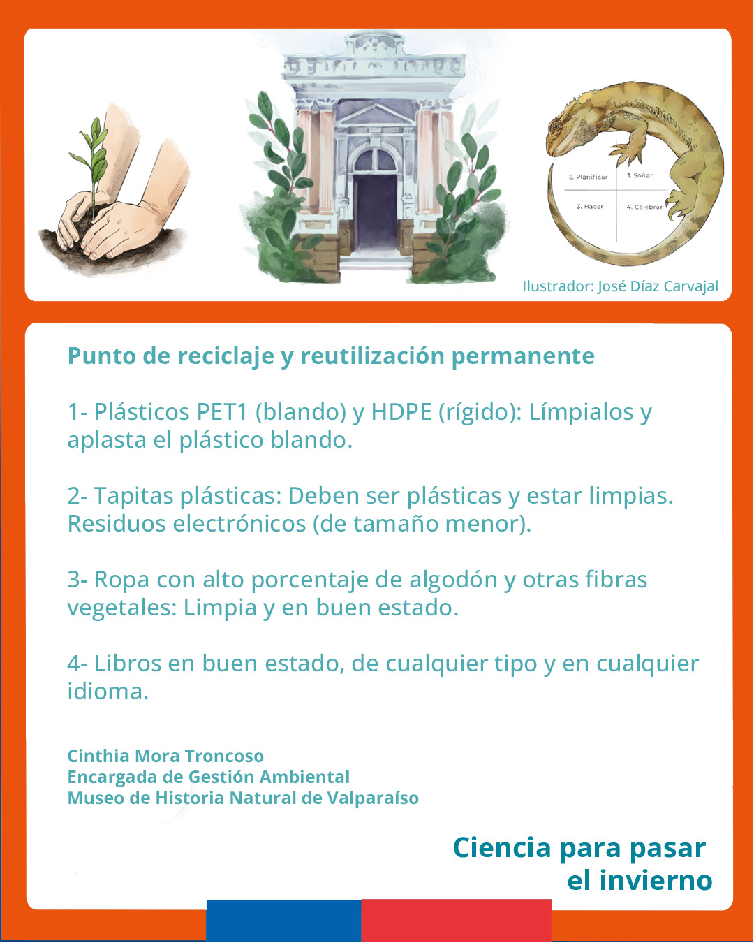 Desde el año 2021 a la fecha el Museo de Historia Natural de Valparaíso promueve reciclar, incentivando a visitantes y a la comunidad en general a realizar acciones de valorizar los residuos contribuyendo a disminuir la cantidad de estos que se disponen en rellenos sanitarios y permitir que se reincorporen como materias primas al proceso productivo, contribuyendo a la economía circular.