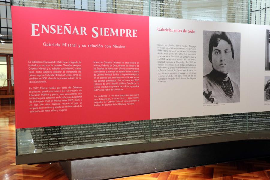 El día de su aniversario se realizó la inauguración de la muestra “Enseñar siempre. Gabriela Mistral y su relación con México”, que conmemora el centenario del arribo de la poeta nacional al país norteamericano y de la publicación de su primer libro, Desolación. Esta muestra fue preparada por el Departamento de Extensión Cultural con la colaboración de Pedro Pablo Zegers, director de la Biblioteca Nacional, experto mistraliano y miembro de número de la Academia Chilena de la Lengua. La exposición ya se puede visitar en la Sala Marta Cruz-Coke.