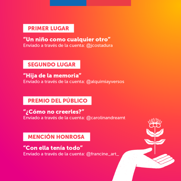 Este concurso de escritura creativa que utiliza la plataforma Instagram para realizar un desafío de “ingeniería escritural”, donde imagen y texto se deben complementar creando una obra única, tuvo de jurado a Nélida Pozo, Directora del Servicio Nacional del Patrimonio Cultural, Sergio Toledo, Gerente de proyectos de Liberalia Ediciones y a Mafalda Galdames, Coordinadora Interregional Centro de ANAMURI (Asociación Nacional de mujeres rurales e indígenas).