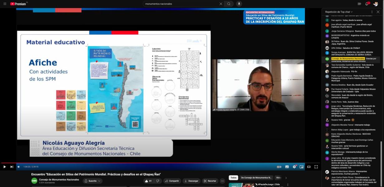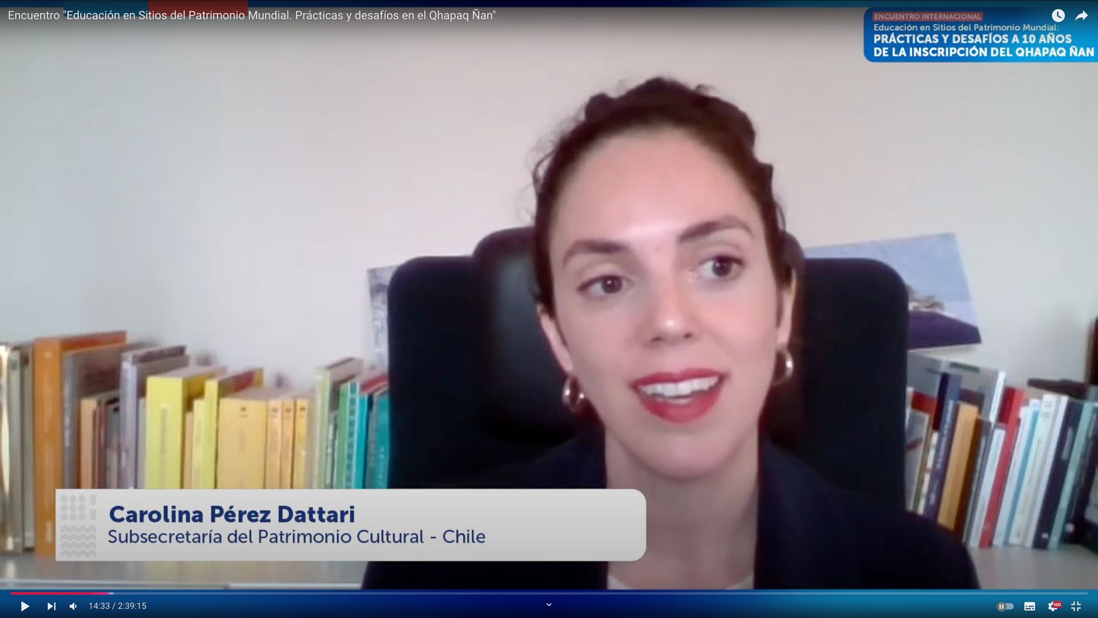 Este miércoles 20 de noviembre se llevó a cabo de manera virtual el Encuentro Internacional: Educación en Sitios del Patrimonio Mundial. Prácticas y desafíos a 10 años de la inscripción del Qhapaq Ñan, organizado por la Secretaría Técnica del Consejo de Monumentos Nacionales (ST CMN) y el Centro Nacional de Sitios del Patrimonio Mundial, ambos dependientes del Servicio Nacional del Patrimonio Cultural (Serpat).
