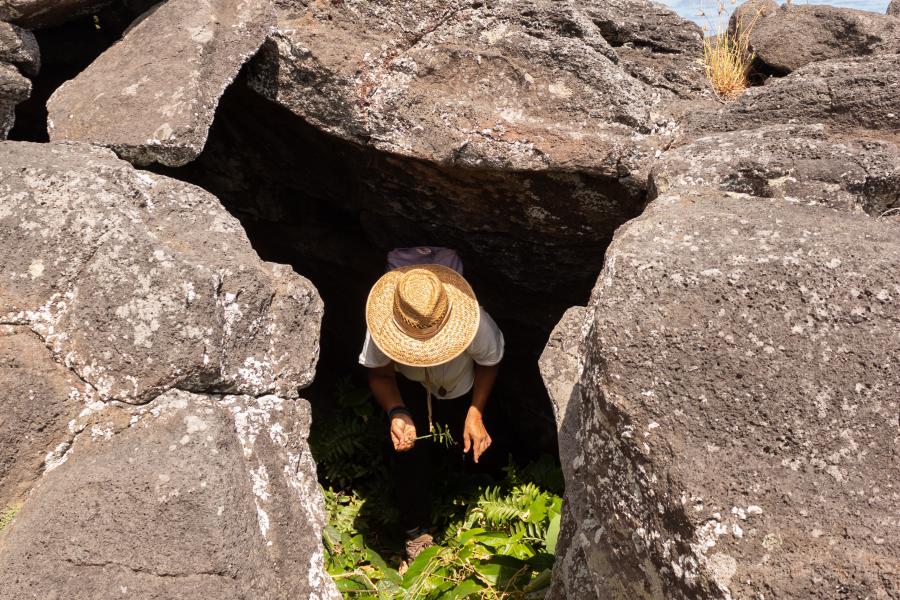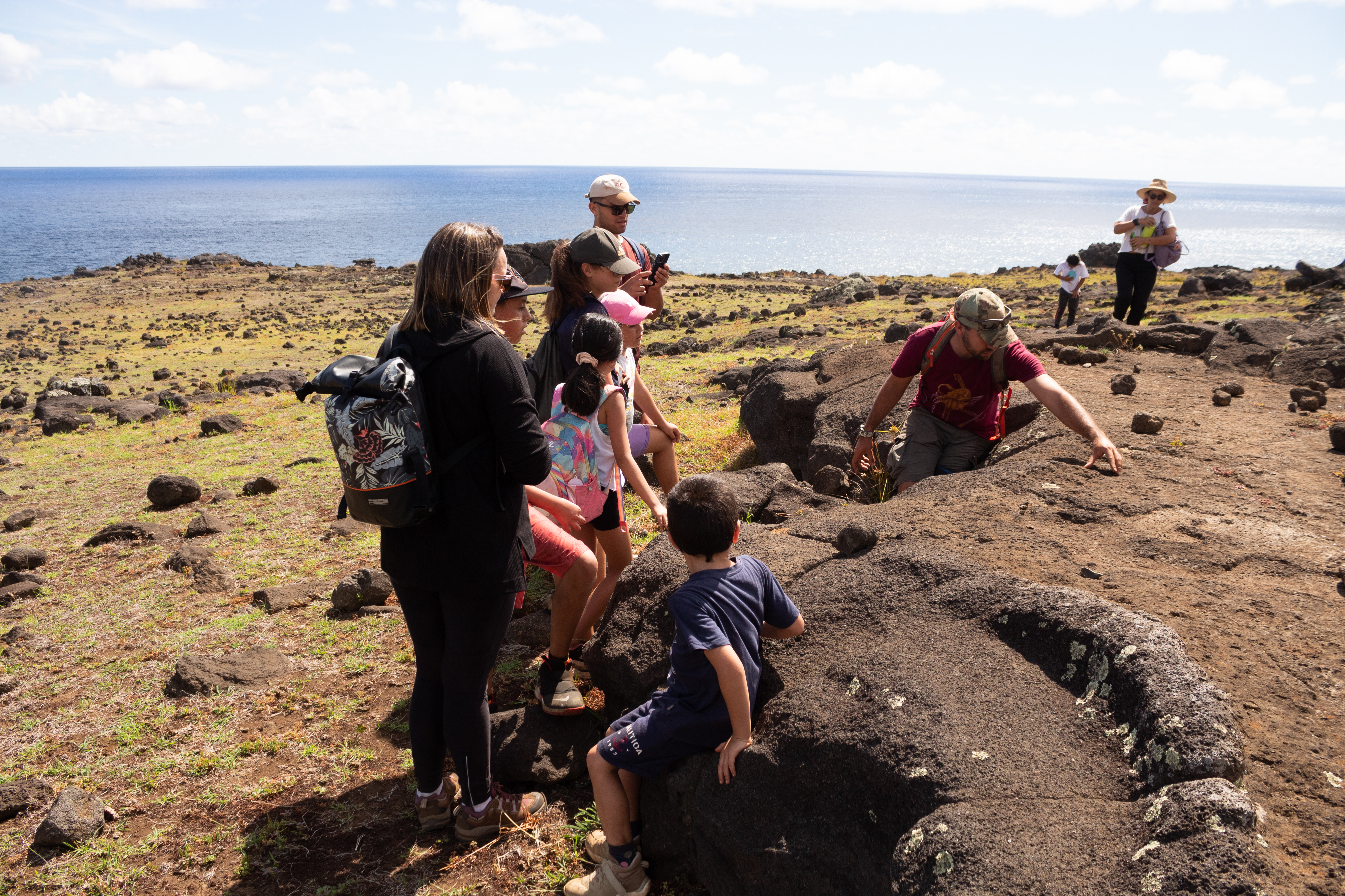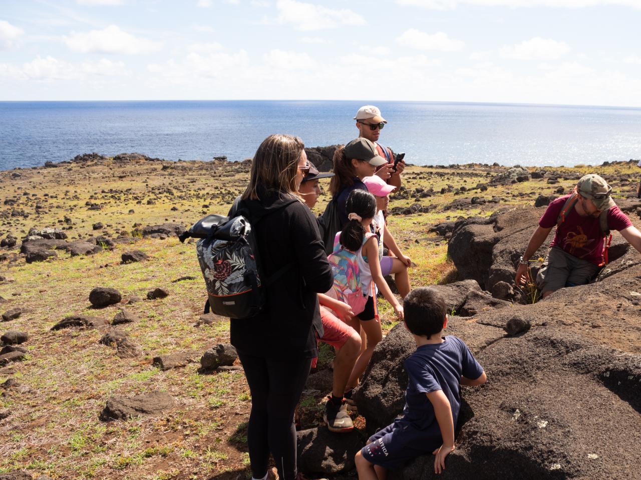 La primera salida se realizó junto a la experta Sonia Haoa en el sector de Rōiho. En este lugar los niños y niñas pudieron conocer a grandes rasgos la formación de la isla y de los conos volcánicos, fenómenos geofísicos, modo de vida antigua a través del uso de jardines de piedra para cultivo de especias y 'umu pae, hornos de piedra.