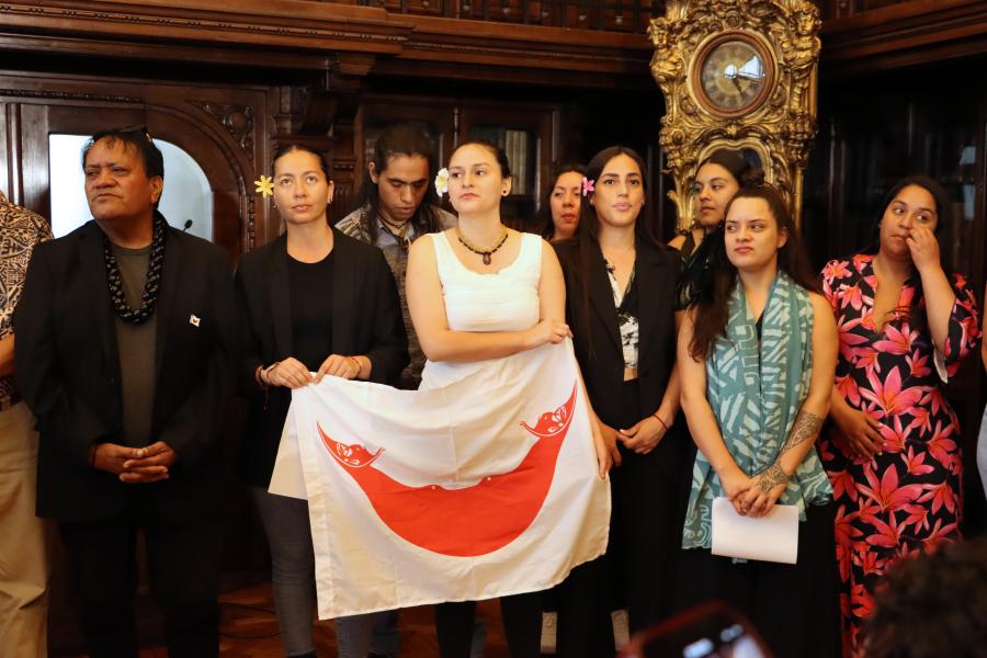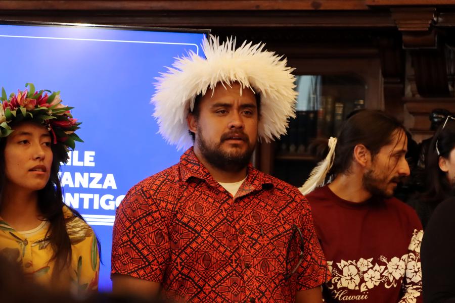En la ceremonia de repatriación y recepción la delegación conformada por el Te Mau Hatu o Rapa Nui- Consejo de Ancianos, Carlos Edmunds, junto a representantes de la Comunidad Indígena Mau Henua, y las y los jóvenes estudiantes universitarios Rapa Nui que residen en Santiago, realizaron un canto a sus ancestros.