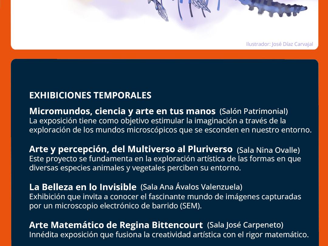 Además de estos eventos, durante todo el mes podrás disfrutar de exposiciones temporales de gran interés, que incluyen "Micromundos: Ciencia y Arte en Tus Manos", "Arte y Percepción: Del Multiverso al Pluriverso", "La Belleza en lo Invisible" y "Arte Matemático de Regina Bittencourt".